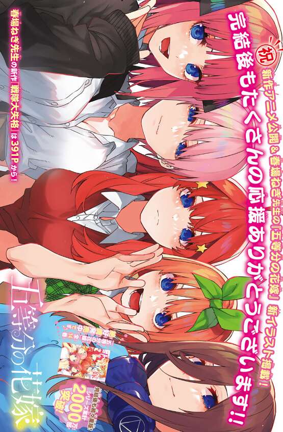 7月12日発売の週刊少年マガジンで、春場ねぎ先生新規描き下ろし『五等分の花嫁』カラーイラストが掲載されています。五つ子キャストの表紙&巻頭グラビアも掲載されているので、興味のある方はチェックしてみて下さい。