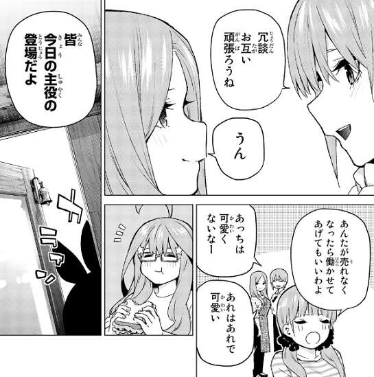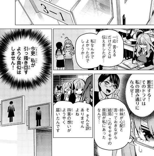 二乃と四葉は暗がりの教室で食堂での話し合いの続きを始めます。二乃は四葉のことがずっと疎ましかった、それまでずっと仲良くやってきたっていうのに、四葉は一人で何も言わず突っ走って、五つ子の輪を乱し始めたのは四葉あんたよ、と二乃は四葉を責めます。四葉は二乃から責められても言い訳せず謝り、私の願いは、私と上杉さんのお付き合いを認めてもらうこと、と正直に自分の願いを話しますが、二乃からまだそんな甘いこと言っているのね、呆れられます。