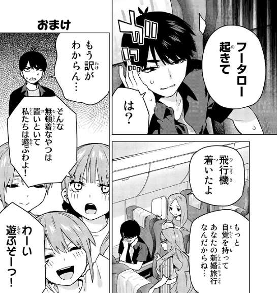 風太郎が目を覚ますと、新婚旅行の目的地に既に飛行機が到着しています。五つ子たち、他の四人も風太郎の新婚旅行に一緒に付いて来ていて、早速遊びに行こうとします。どこに行こうかと一花たちが悩んでいると、風太郎はめちゃくちゃ楽しみにしていたと、風太郎お手製の旅のしおりを取り出します。
