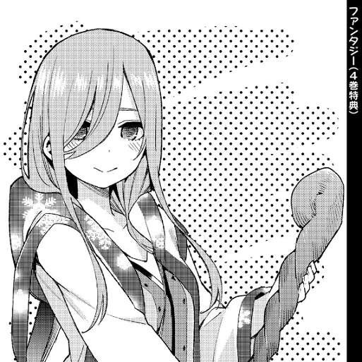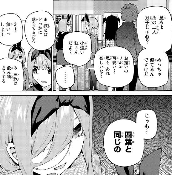 夜の海で会っていた四葉と三玖ですが、風が強くなり電車が止まってしまい、家に帰れなくなってしまいます。四葉と三玖はカラオケ店に入って朝まで時間を潰すことにし、三玖は一花に電話で朝までカラオケ店にいると連絡します。四葉はドリンクバーで飲み物を用意していると三玖が戻ってきます。四葉が三玖に飲み物どうする?と質問すると、じゃあ…、四葉と同じの、と四葉とお揃いのリボンをした三玖が返事をしてきます。