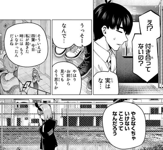 学園祭も終わり、風太郎は待ち合わせをしていますが、待ち合わせ相手は告白したはずの四葉ではなく一花でした。一花はお出かけ先でバトミントンを楽しんでいますが、運動が苦手な風太郎は息が上がっていて全然楽しんでいるように見えません。バトミントンの後、一花は四葉が俺のことを好きだと言ってくれた事を風太郎から聞きます。そして四葉からまだやらなくちゃいけないことがあります、と言われ風太郎と四葉はまだ付き合っていない事を、一花は風太郎から聞かされます。