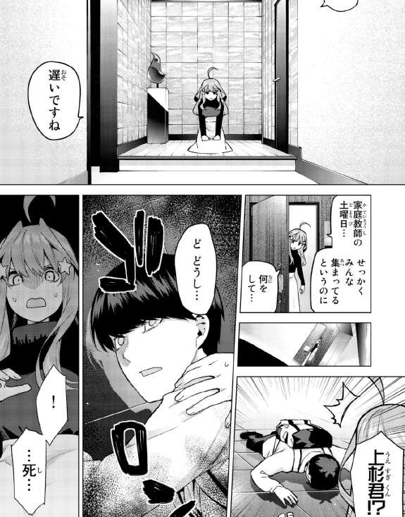 期末試験対策、その大事な家庭教師の土曜日の日に五月は風太郎を待っていますが、風太郎はなかなか来ません。ドアの外を確認すると風太郎は倒れています。が、倒れているのではなく死んだように寝ているだけでした。勉強に集中しすぎて、寝不足になっていただけでした。
