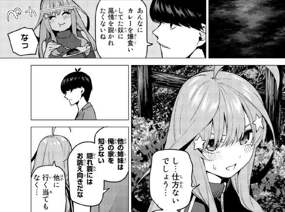 明日には帰るように言う風太郎に、頑なに二乃が先に折れるまで五つ子の自宅には帰らないと五月は言います。金持ちお嬢様にこれ以上は耐えられないと言いますが、自分たちはお嬢様でなく、数年前まで極貧生活だったと五月は言います。今の父と実母が再婚する事で極貧生活から変わったようです。