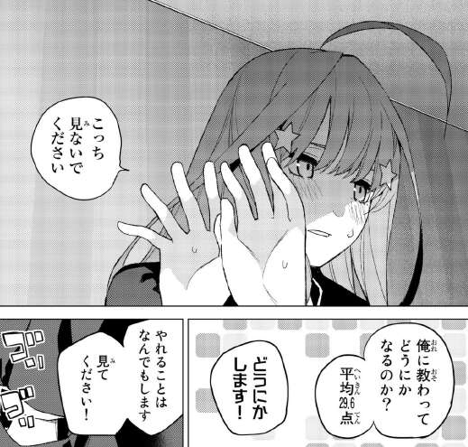 風太郎が勉強をする理由を知りたいと言う、五月ですが風太郎は諦めるまで睨み続けると言い理由を五月に話しません。