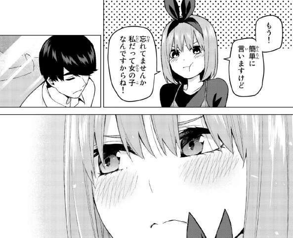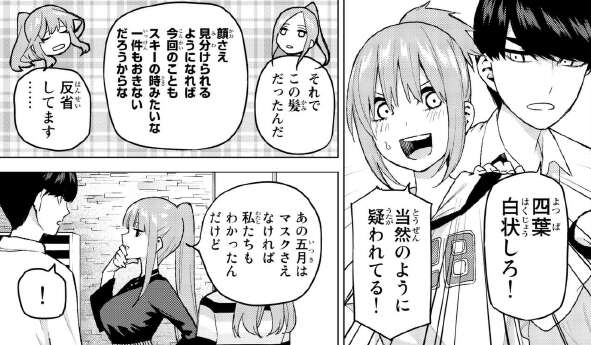四葉は機転をきかせて、二人を巧みに誘導すると言います全く二人を遠ざける事ができず、むしろ二人が隠れている試着室に、一花が入ってこようとしてしまいます。なんとか一花を試着室に入らせないようにするため、服の試着は四葉がする事になります。