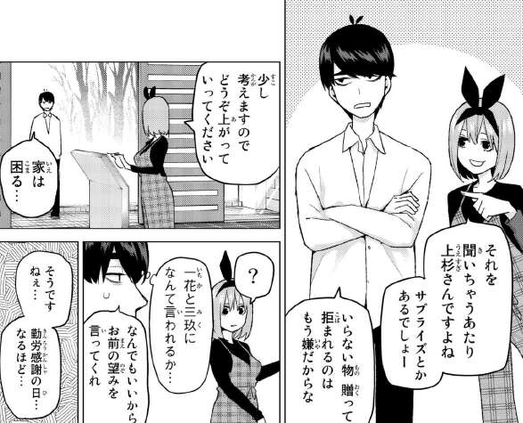 一花と三玖が同時に風太郎を休みの日に遊びに誘いますが、風太郎は休日だからと断ります。休日は自分の自習時間にあてたい風太郎ですが、らいはに促されて四葉に林間学校の時の感謝の気持ちを伝えに行きます。感謝の気持ちを贈り物にすると言う風太郎ですが、突然来た風太郎に戸惑う四葉です。しかし、いいお出かけスポットがあると風太郎を誘います。