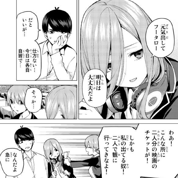 明日からいよいよ期末試験のテスト週間に突入するという事で、風太郎は気合がはいっています。なんとしても五つ子全員、赤点回避するようにしないといけません。が、いきなりテスト勉強に五つ子全員揃わず、仕方なく五つ子は各自自習とします。この時、一花は三玖と風太郎をくっつけようと映画のチケット2人分を渡します。