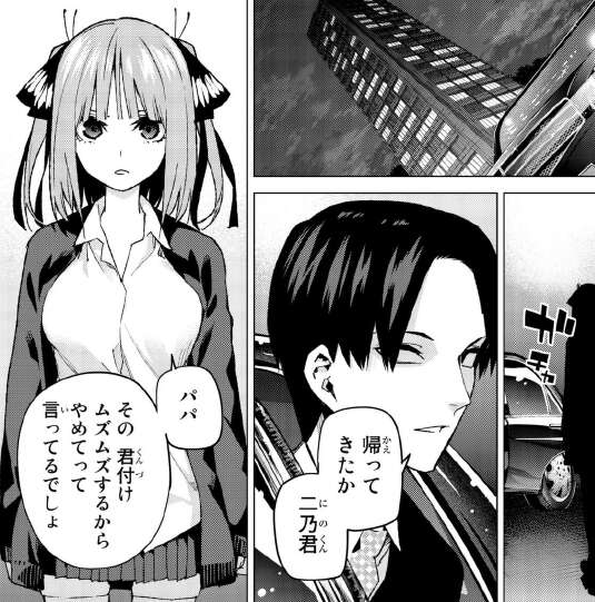 期末試験は無事終わり、全員赤点回避を出来ましたが二乃だけが期末試験後、どこかに行ってしまい風太郎は二乃を探しに出かけます。場面変わって、二乃は状況を報告すべく中野パパに直接会って話をします。今後も五つ子たち全員で頑張る事を伝えますが、中野パパに反対されますが、そこに風太郎が現れます。
