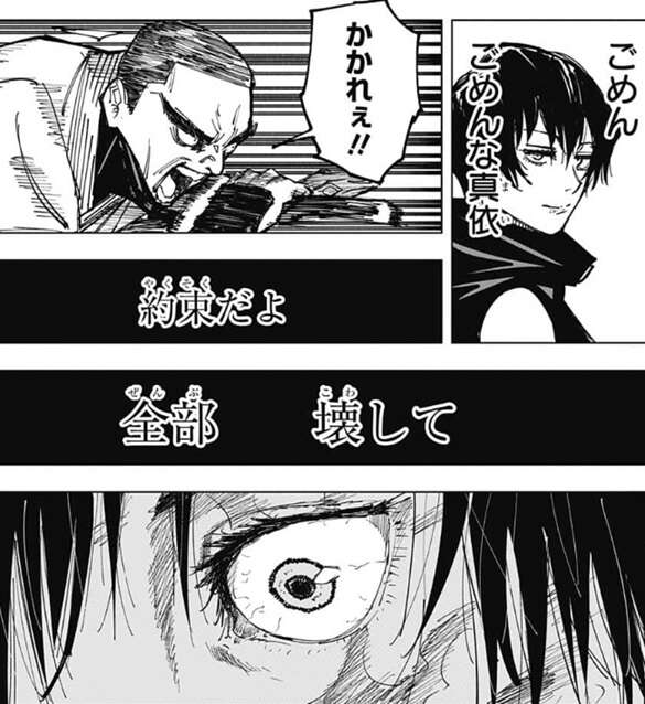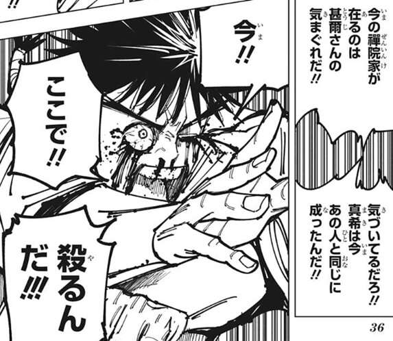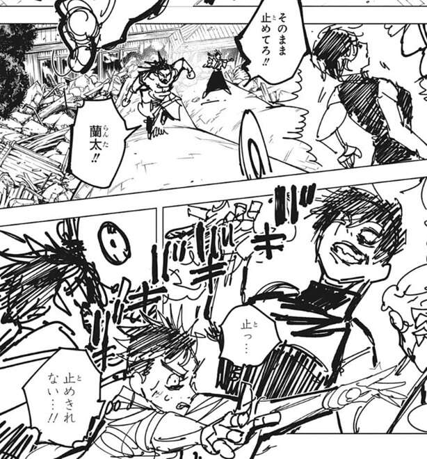 甚壱は蘭太にそのまま止めているように言い、真希を攻撃しようとしますが蘭太の術式が破られそうになります。さらに巨大な目が受けた傷は、そのまま蘭太自身にフィードバックされるようで、蘭太は目から血を吹き出します。蘭太の負傷を気にして甚壱は足を止めようとしますが、蘭太は、今の禪院家が在るのは甚爾さんの気まぐれだ!!気づいているだろ!!真希は今あの人と同じに成ったんだ!!と、叫び、今ここで真希を殺るように甚壱に叫びます。