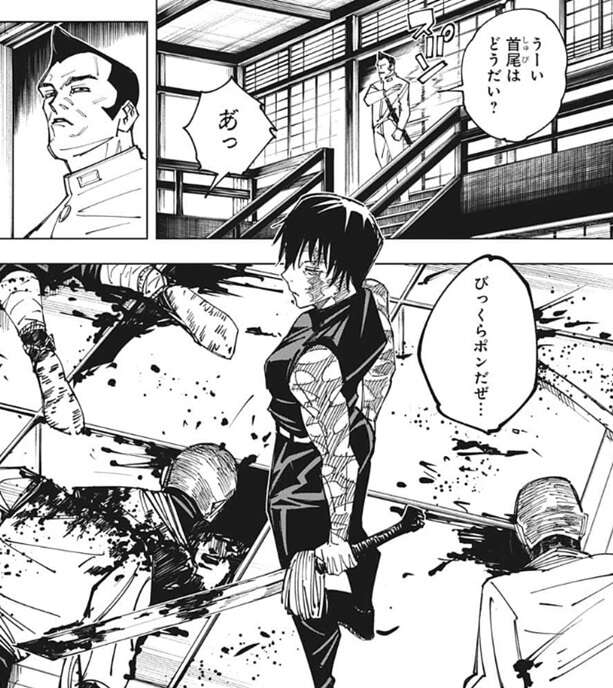 扇が殺された事に驚く甚壱と直哉ですが、躯倶留隊の隊長・禪院信朗は、寝込みや便所を襲われれば扇でも不覚を取られることもあると冷静で、躯倶留隊に、俺が着く前に引っ捕えろ、と命令を出します。そして、躯倶留隊は噸の間で正体不明の呪具を二振り持っている真希を発見、真希を取り囲みます。