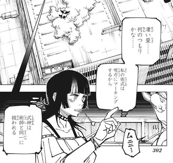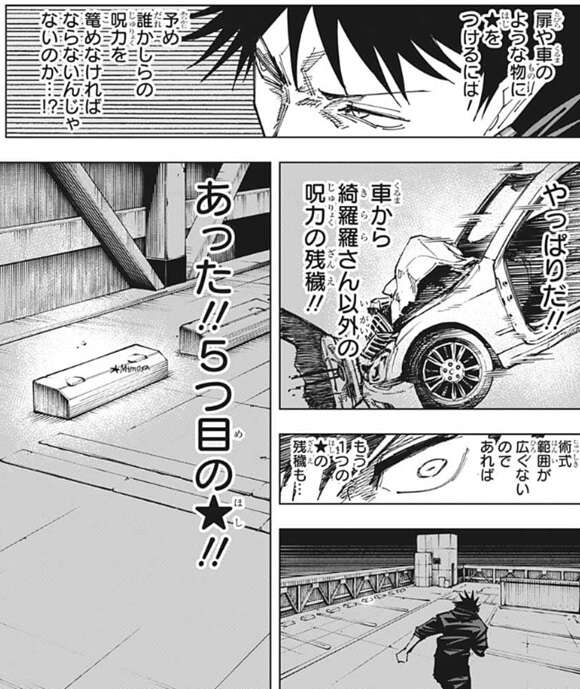 伏黒はパンダに星綺羅羅の術式に気を付けるように注意しつつ、★マークを探します。伏黒は今までの状況から、★マークは物でなく呪力につけていると推測します。扉や車のような物に★マークを付けるには、予め誰かの呪力を籠めていると予想し、伏黒は改めて車を観察します。すると予想通り、車には星綺羅羅以外の呪力の残穢が残っており、伏黒はもう1つの★マークの残穢を探します。すると、車止めの所に「Mimosa、ミモザ」と書かれているのを伏黒は見つけます。