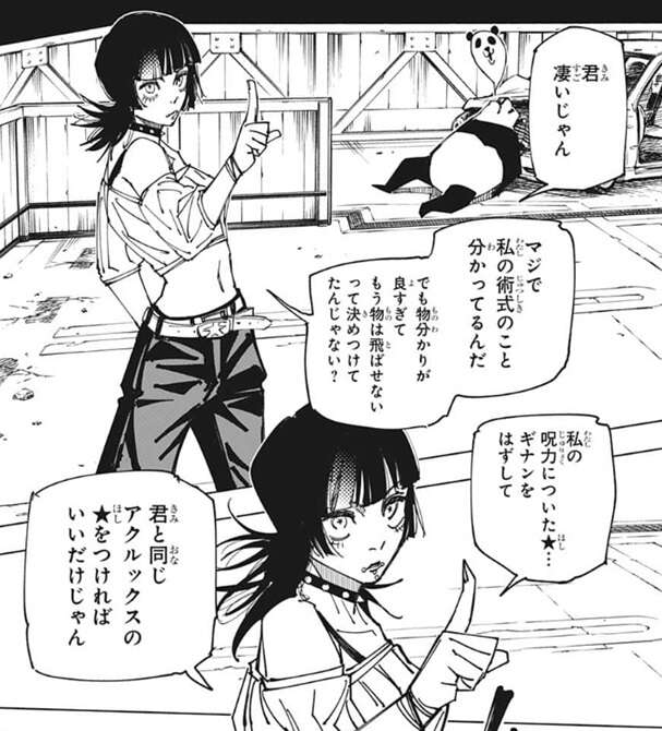 術式がバレたなら、攻めるでしょ!!と、星綺羅羅は心の中でつぶやき、車を足で踏みつけて車にも★マークと「Imai、イマイ」を書き込みます。すると、同じ「Imai、イマイ」が書かれているパンダに車が引き寄せられます。パンダは自身の怪力を発揮して、車を何とか受け止めます。
