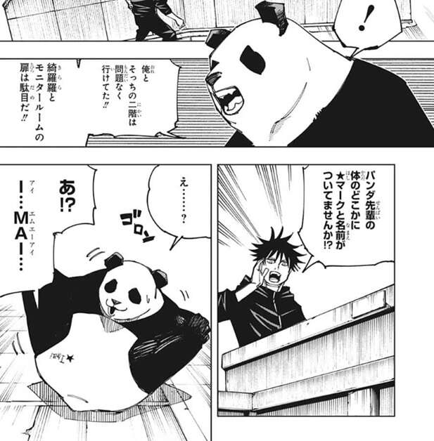 伏黒は脱兎を解除すると、パンダに脱兎がどうだったか?と、質問します。最初、パンダは質問の意味が分からなかったのか、俺の次にカワイかった!!と、返事をして伏黒に怒られます。何に近づけて、何に近づけなかったか聞いてんですよ!!と、伏黒が聞き直すと、パンダはそっちの二階には行けたが、星綺羅羅とモニタールームの扉には近づけなかったと答えます。さらに、伏黒が体のどこかに★マークと名前がついていないか聞くと、パンダは自分の体、お尻の辺りに「Imai、イマイ」と書かれている事に気付きます。
