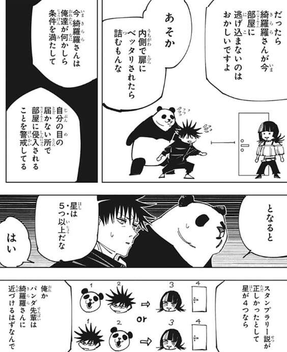 術師本人は術式の対象外では?と、パンダは聞きますが、それだと星綺羅羅が扉の向こう、モニタールームに逃げ込めば、扉に近づけない伏黒やパンダはそれで詰んでしまうので、状況から星綺羅羅自身も術式の対象のようです。しかしそれなら星は5つ以上ないとスタンプラリー説が正しいことになりません。星4つなら伏黒かパンダが星綺羅羅に近づけるはずなので、間に五つ目の星があって伏黒とパンダはそこを経由しないと、星綺羅羅や扉に近づけないようです。
