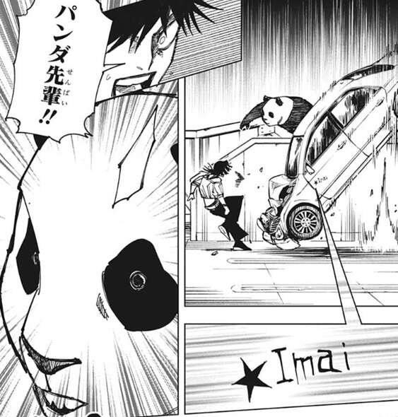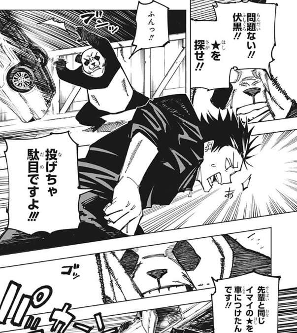 パンダは車を受け止めると、伏黒に★を探すように言います。そしてパンダは流れで車を投げてしまいますが、車にはパンダと同じ「Imai、イマイ」が書かれているので、再びパンダに車は引き寄せられ、車はパンダに衝突してしまいます。