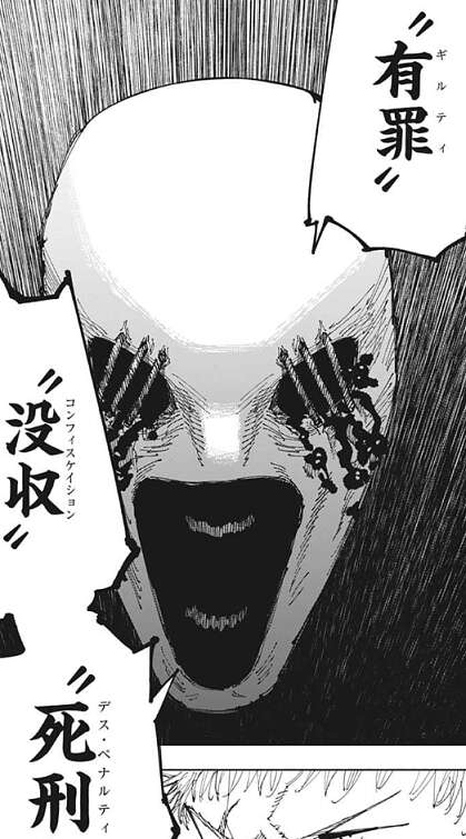 ジャッジマンは虎杖に、「有罪(ギルティ)」「没収(コンフィスケイション)」「死刑(デス・ペナルティ)」を宣告します。