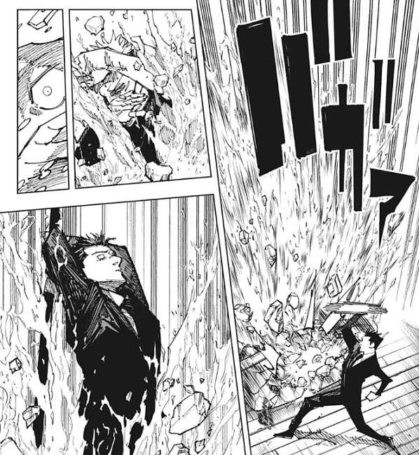 日車は木槌を元の大きさに戻し、虎杖に木槌を奪われることを防ぎます。虎杖は後ろに下がると、日車が入っていたバスタブを蹴って日車にバスタブをぶつけようとします。すると、日車はバスタブを木槌で破壊し、バスタブの中に入っていた水が虎杖の方に向かい、虎杖の視界を奪います。