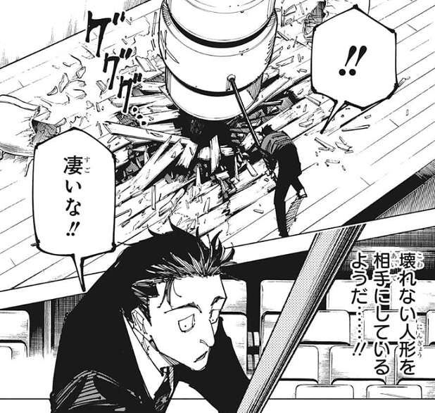 日車は虎杖と話しつつ、虎杖が呪力なしで自分と対等に渡り合えている事に驚愕します。虎杖が呪術師としてではなく生来の肉体、生物としての強度が恐ろしく高いことに日車は気付きます。また術師は術式が使用できなくなると、長年の勘が鈍るのか基礎的な呪力操作もグダグダになることが多かったようですが、虎杖がそれより不利な、完全な呪力の使用不可の状態で、これだけ自分と戦えている事実に脅威を感じ、日車は虎杖を全力で潰す決意をします。