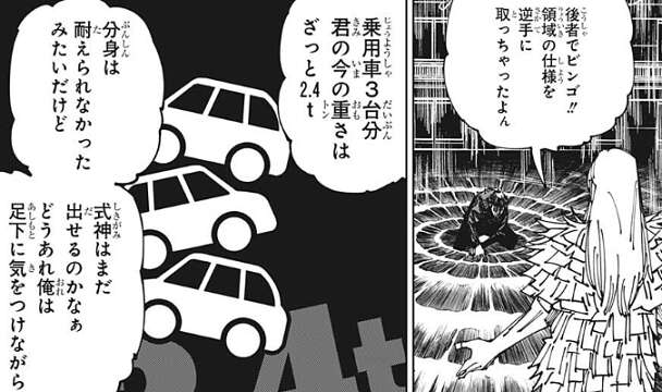 上も影だ!!と、伏黒が言うと天井の影から満象が出現、レジィの所に落ちてきます。レジィも満象の重さを引き受けることになり、レジィと伏黒の重量の我慢比べが始まります。