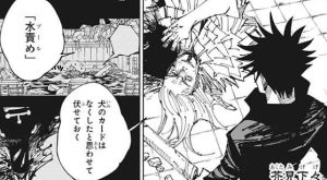 乙骨も反撃しようとしますが、再び烏鷺が空間を歪めると今度は乙骨の腕が変形してしまいます。再び乙骨は吹っ飛ばされますが、今度は乙骨も攻撃をガードして最小限のダメージにします。地面に着地した後、乙骨は自身の腕を見ると、腕は戻っていて異常はありません。乙骨は烏鷺の術式を、多分空間をイジる術式で空間ごと相手を潰したりは出来ないようなもの?と、数即死ます。