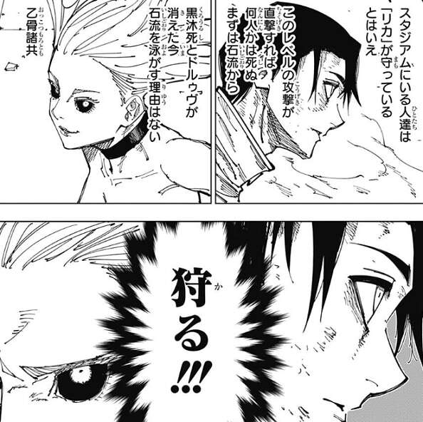 突然の石流の攻撃に驚く乙骨と烏鷺ですが、二人とも何とか回避します。石流は目の前で会話されたから、攻撃したようです。乙骨は、攻撃範囲が広くスタジアムは「リカ」が守っているとはいえ、このレベルの攻撃が直撃すれば何人かは死ぬ、とまずは石流を狩ることにします。烏鷺も黒沐死とドルゥヴが消えた今、石流を泳がす理由はなく、乙骨諸共狩る決意をします。