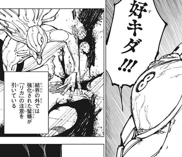 三人が同時に領域展開を行いますが、領域の押し合いの最中はそれぞれの必中術式は打ち消し合います。その間に「リカ」に邪魔されないように、「リカ」を結界内に入れない、という石流と烏鷺の利害が一致します。ただ「リカ」は直前に石流に20m強殴り飛ばされているため、結界の構築には間に合いません。しかし「リカ」に残された折本里香の遺志がそれを許さず、憂太を返せ、と「リカ」は言うとギアを更に一段上げて結界内に強引に入ろうとします。