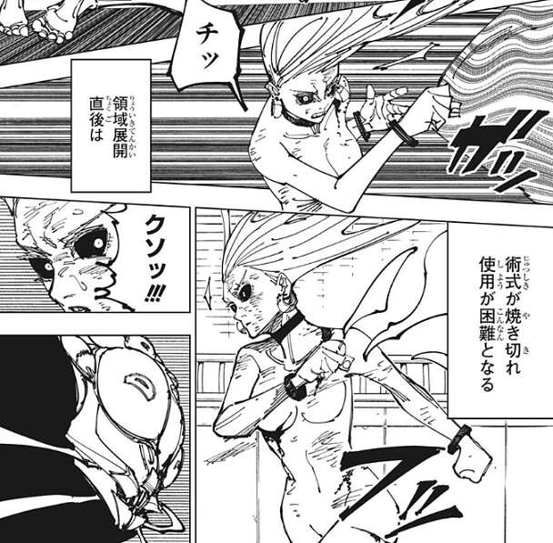 乙骨の攻撃で地面に蹴り飛ばされますが、そこに黒沐死が襲い掛かります。烏鷺は空間を歪めて黒沐死の攻撃を防ごうとしますが、領域展開直後のため、術式が焼き切れていて空間を歪めることが出来ません。