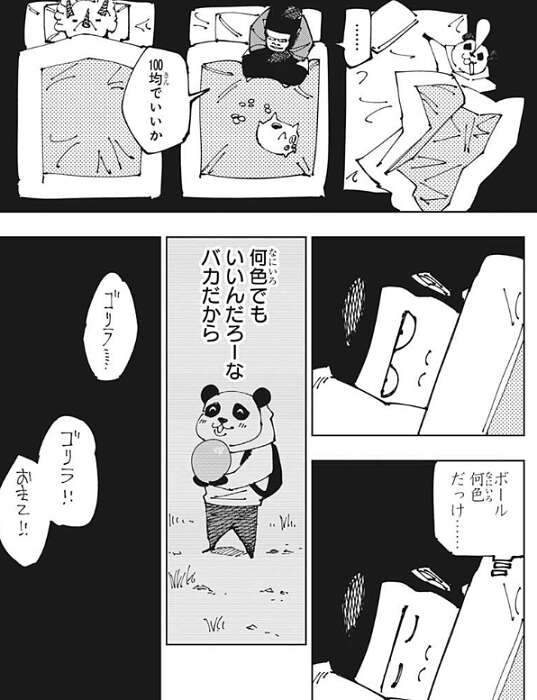 その夜、お兄ちゃんのゴリラは貯金箱の中身を確認し、ボールを100均で買おうと考えます。そして、パンダが持っていたボールが何色だったか思い出しつつ、何色でもいいんだろーな、バカだから、と思いながら眠りにつきます。