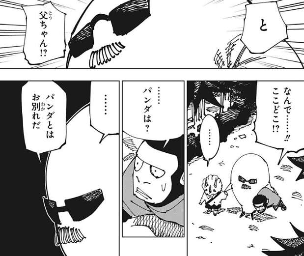 その後、寝ているお兄ちゃんのゴリラは、父ちゃんと呼ばれる夜蛾正道に似た生き物に起こされます。そして、パンダとはお別れだ、とお兄ちゃんのゴリラは父ちゃんに突然、言われます。
