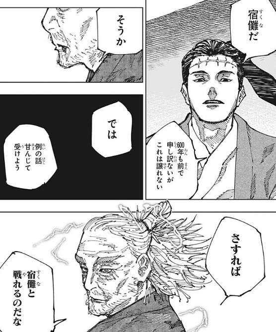 鹿紫雲一は羂索に、貴様の知る最強の術師は?と、質問すると、宿儺だ、600年前で申し訳ないがこれは譲れない、と羂索は答えます。400年前の鹿紫雲一は羂索の答えを聞くと、例の話甘んじて受けよう、さすれば、宿儺と戦れるのだな、と言うと、身体に稲妻のような呪力が走ります。
