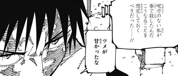 場面は桜島結界(コロニー)に戻り、真希は芋虫呪霊状態の直哉を見ながら、呪力の無い私が拳で殺したんだ、こうなることを想定しておくべきだった……!!と、思いツメが甘かったと後悔します。しかし、自分を殺したのは真希の母親だと直哉が言うと、真希は動揺します。