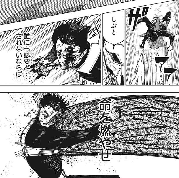 直哉は、加茂憲紀が外に出して操った血液も循環させて、また体に戻している事に気付き、これなら失血死はしないと納得します。それでも加茂憲倫はかなりしんどいはずで、しんどいやろ、死ぬで憲紀君、と直哉は加茂憲紀に話しかけます。加茂憲倫は直哉には答えず、真希にいったん外に出るように言います。