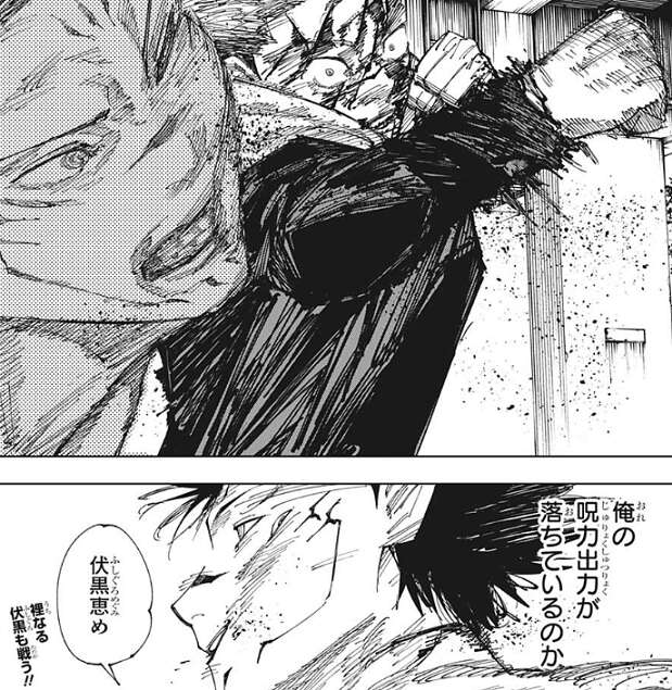 宿儺のそばまで来た虎杖は、宿儺にパンチをくらわせます。ここで宿儺は、自分の呪力出力が落ちている事に気付きます。伏黒の名前を宿儺がつぶやいているので、伏黒が肉体を乗っ取られながらも宿儺に抵抗しているのかもしれません。