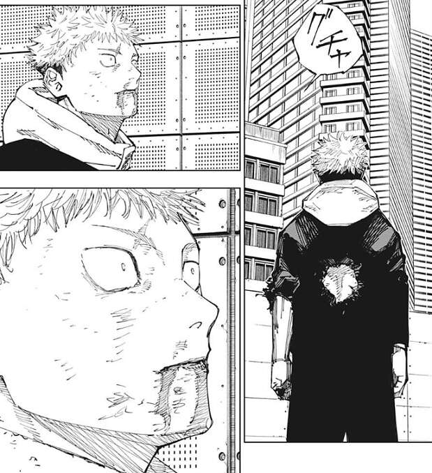 虎杖が宿儺に攻撃した衝撃で、ビルの一部が崩壊します。虎杖の異常な力に、どういうことだ?なんだこの力は、と宿儺が心の中でつぶやき、戸惑います。虎杖はさらにビルの壁を宿儺の方に蹴飛ばして、ビルの壁を宿儺にぶつけます。