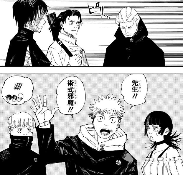 険しい表情の五条を見た高専メンバーは、ピリっと緊張した雰囲気になります。しかし、先生!!術式邪魔!!と、虎杖は緊張することもなくマイペースに五条に話しかけます。