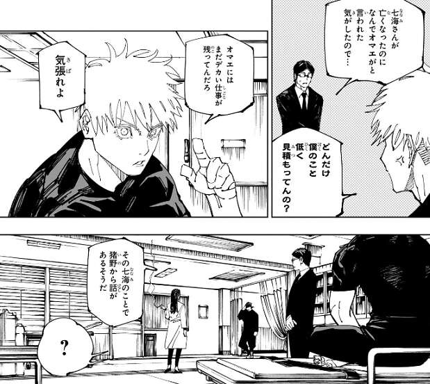 場面変わって、五条と家入、伊地知が会話をしていて、五条は俺たちもついに3人になっちゃったね、とつぶやきます。しかし、まだ一人半端になってる奴がいるだろ、と恐らく夏油傑の事を家入が言い、五条もそれに同意します。七海はなんやかんやで生き残るタイプだと思った、と五条が言うと、伊地知はお前のせいで七海が亡くなったと言われた気がしたと五条に謝り、どんだけ僕のこと低く見積もってんの?と、五条は伊地知に怒ります。五条は伊地知に、まだデカい仕事が残っていると言い、気張るように言い檄を飛ばします。一方、渋谷事変で負傷していた猪野ですが、七海の事で話があると五条に会いに来ます。