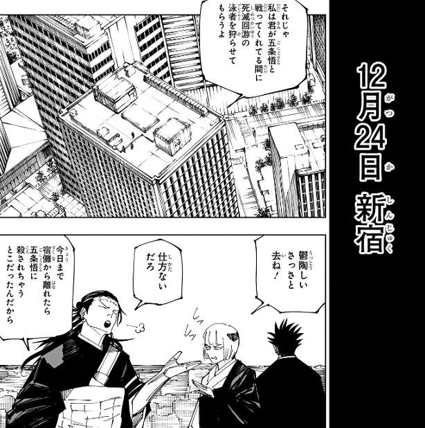 いきなりですが、五条と宿儺の最終決戦の日である12月24日となりました。12月24日まで最低でも数話くらいかけると思っていましたが、かなり速いペースで最終決戦の日を迎えました。