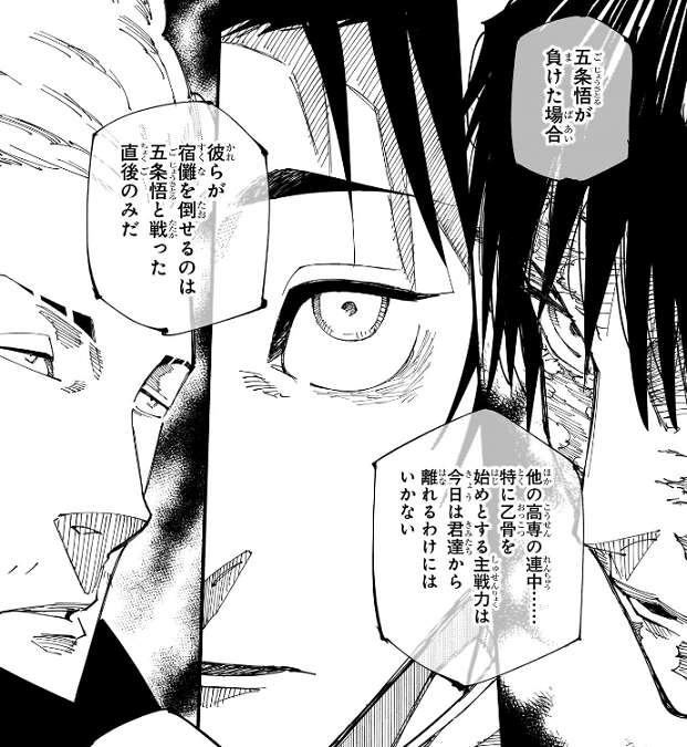 五条悟が負けた場合、乙骨や真希、秤などの高専の主戦力が宿儺を倒せるのは五条と戦った直後のみなので、高専の主戦力は今日、宿儺から離れることが出来ない、と羂索は読んでいるようです。よって羂索は今日、高専の主戦力が動けずフリーの状態で動けるので、これからプレイヤーを狩りに行くようです。
