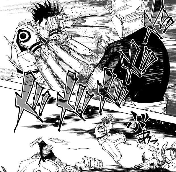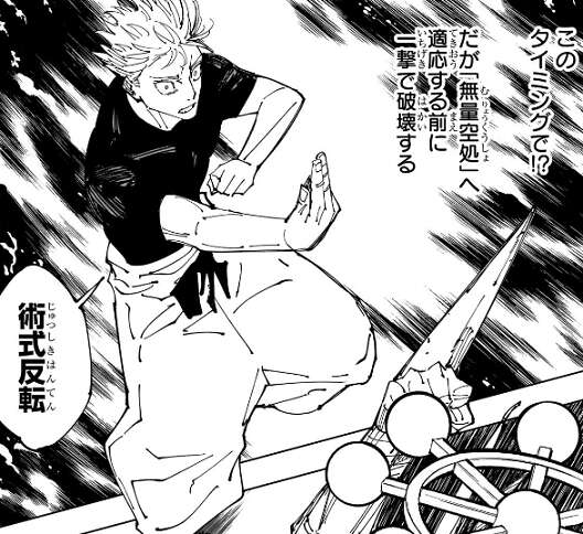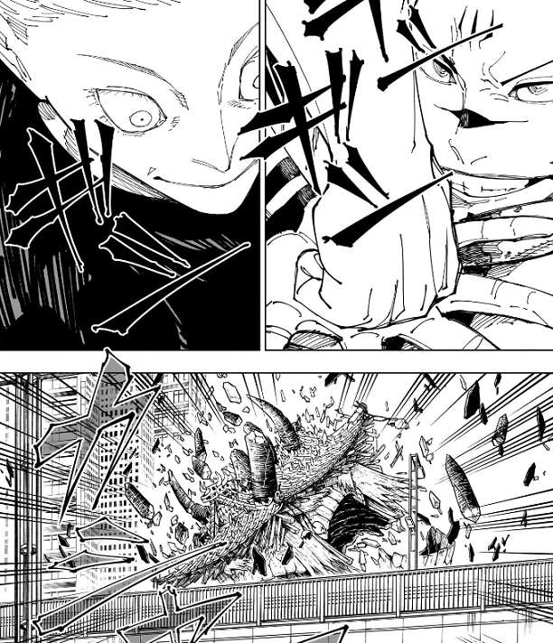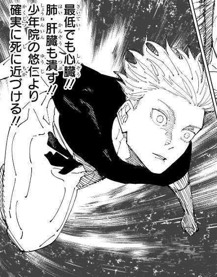 そこに五条は宿儺に追い打ちを仕掛けようとし、最低でも心臓を潰し、さらに肺・肝臓も潰して、少年院の虎杖より確実に死に近づけようとします。