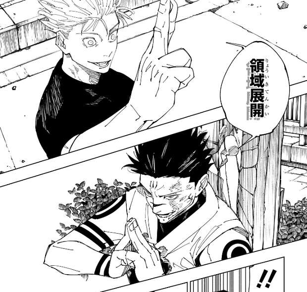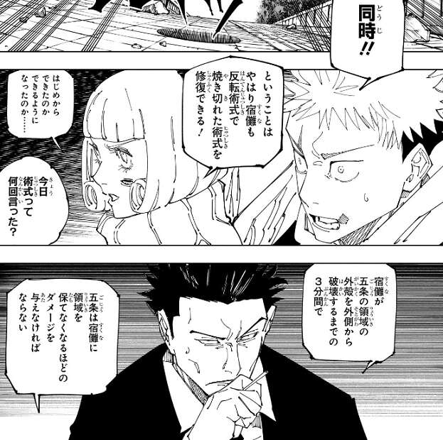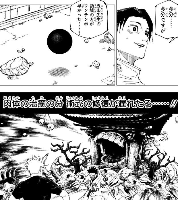 どうやら宿儺は五条に受けた肉体のダメージの治癒を行った分、術式の修復が遅れたようで五条の領域の方がワンテンポ早く展開で来たようです。乙骨と日車は五条がワンテンポ早かった事に気付いたようです。