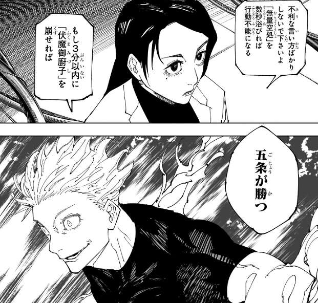 しかし、家入は五条に不利な言い方ばかりしないで下さいよ、と言うと、「無量空処」を数秒浴びれば行動不能になるので、3分以内に「伏魔御廚子」を崩せれば五条が勝つ、と家入は断言します。