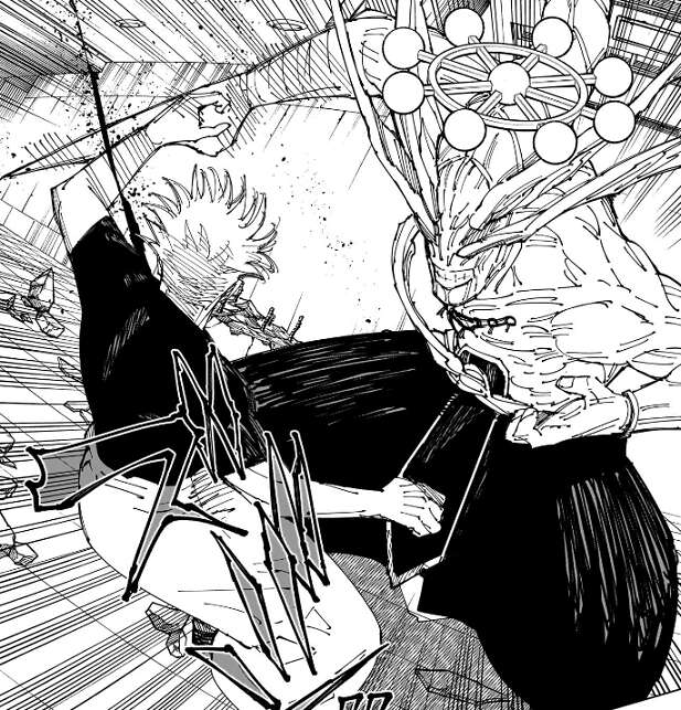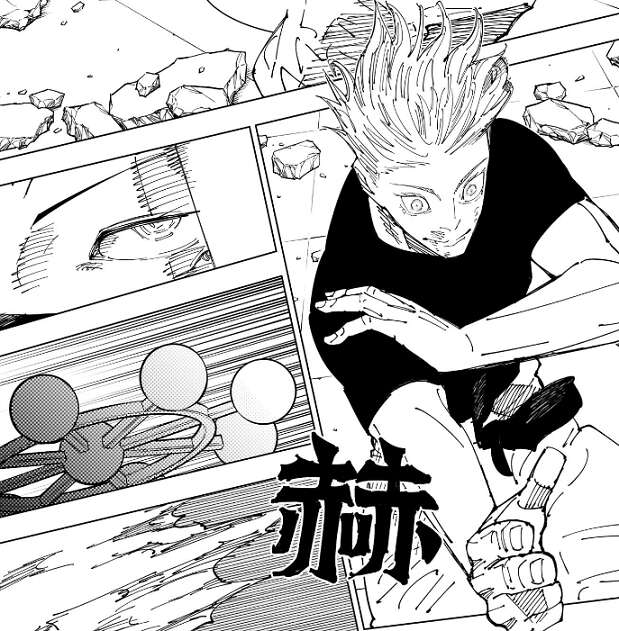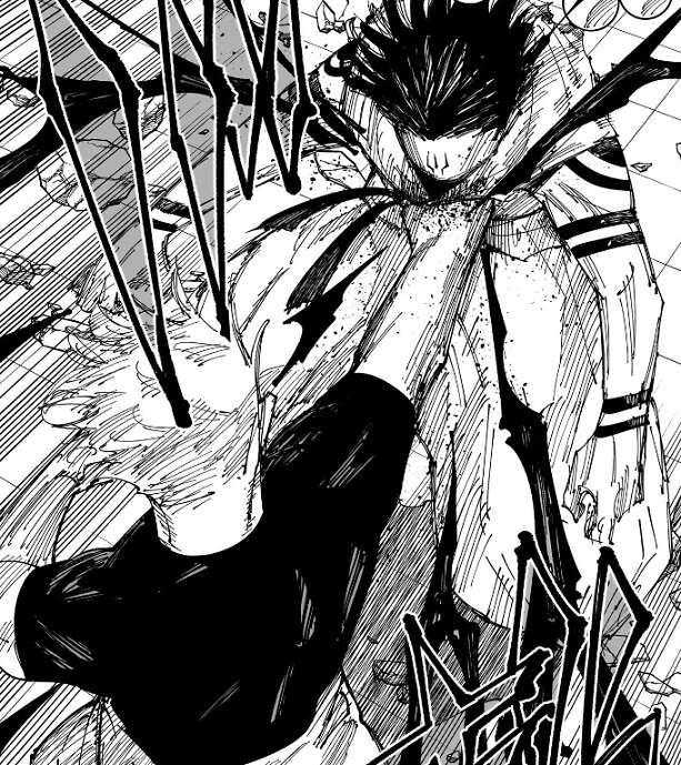 宿儺は術式順転「蒼」の攻撃を全て避けますが、五条は宿儺に近づき蹴りをくらわせます。宿儺はダメージを負いますが、致命傷を与える事は出来ません。