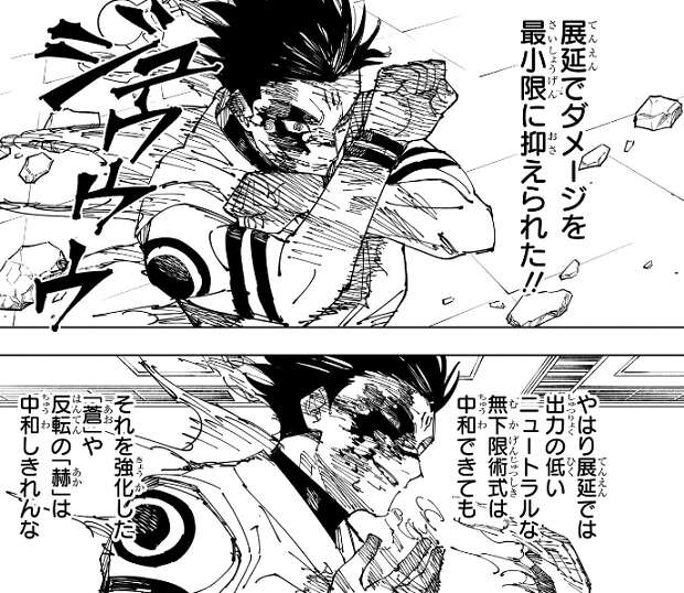 展延で防がれた事で、宿儺にダメージを最小限に抑えられてしまいます。さすがに展延ではニュートラルな無下限呪術を中和できても、強化した「蒼」や反転の「赫」は完全に中和することは出来ないようです。