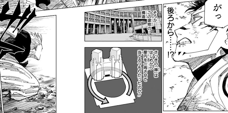 建物の構造を利用して、五条は始めから「赫」は屋内を一周させてから当てるつもりだったようです。後ろから「赫」を当てられて、宿儺は「赫」を防ぐことが出来ずまともに攻撃をくらいます。