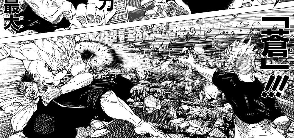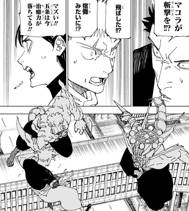 魔虚羅が宿儺のように斬撃を飛ばしたことに、高専メンバーは驚き、家入は治癒力が落ちている五条を心配します。すぐに右腕を治せない五条に、魔虚羅と顎吐が襲い掛かります。