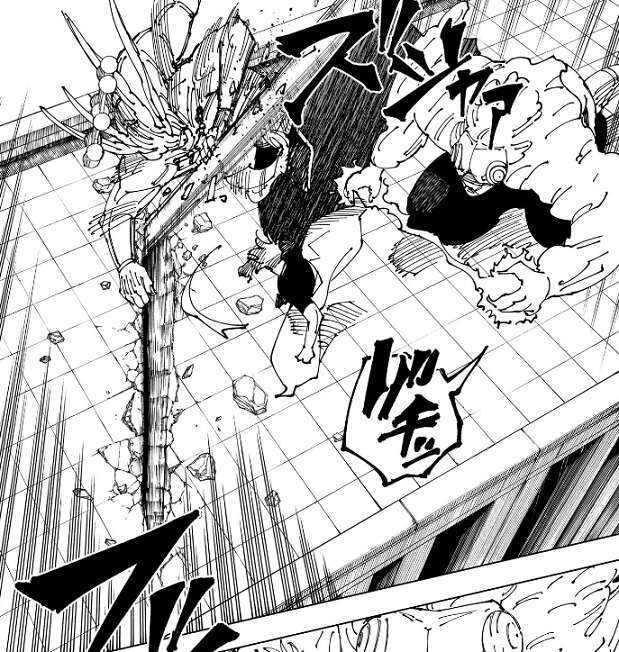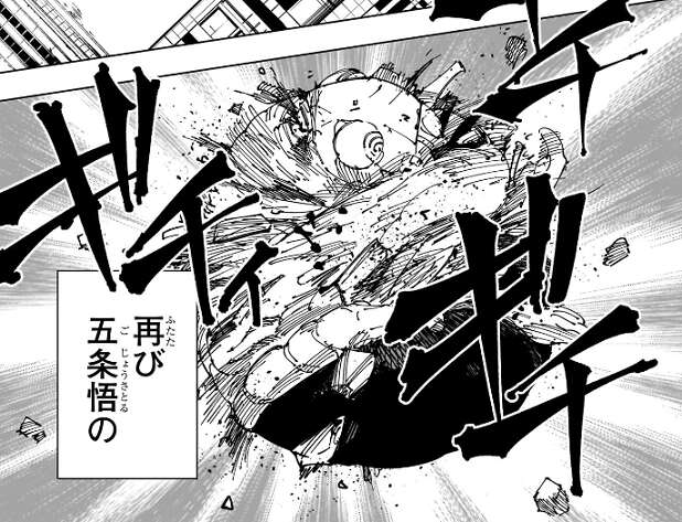 さらに影から宿儺も出てきて五条に蹴りを入れます。宿儺の蹴りで吹っ飛ぶ五条に、顎吐が雷撃の効果を加えてパンチをさらに加えますが、さっきからオマエだけ釣り合ってねーんだよ、と顎吐のパンチに耐えた五条は顎吐に言い放ちます。そして、無下限呪術に適応していない顎吐に、無下限呪術を応用した拳を浴びせます。