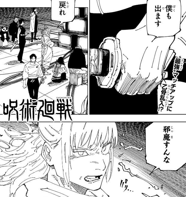 秤も鹿紫雲一が正しいと乙骨を止めようとしますが、式神2体なら自分とリカちゃんで引き受けられる、絶対に役に立つ、と乙骨は言い戦闘に乱入しようとします。真希は、出るなら私だ、と言い乙骨に自分の役割を忘れるなと注意しますが、乙骨に、やってくれ、必要だろ、と虎杖は言い、虎杖だけは乙骨に賛成します。