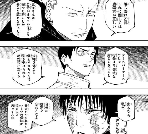 裏梅もいるので、下手に刺激して宿儺が切り札を出してしまうより、全てを出し切るわけにはいかない宿儺に足手纏いなしの全力の五条を当てるのが、一番勝率が高い、と日下部は言い、乙骨もしぶしぶ納得して戦いへの乱入を止めます。しかし、鹿紫雲一だけは納得せず、これは五条のための戦いだから、どうなろうと割って入るのは野暮ってもんだ、と鹿紫雲一はつぶやきます。
