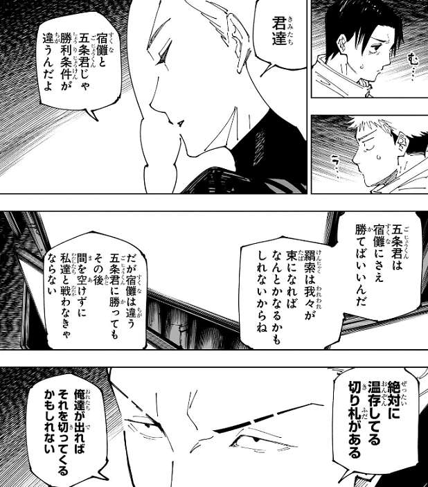 しかし、ここで日下部と冥冥が乙骨と虎杖に、宿儺と五条では勝利条件が違うと言い、乙骨に参戦を止めるように言い聞かせます。五条は宿儺にさえ勝てば、羂索は残った高専メンバーで束になればなんとかなるかもしれない、だが宿儺は五条に勝っても間を空けずに高専メンバーを戦う必要がある、と冥冥は言います。そして、絶対に温存してる切り札がある、と秤は断言します。