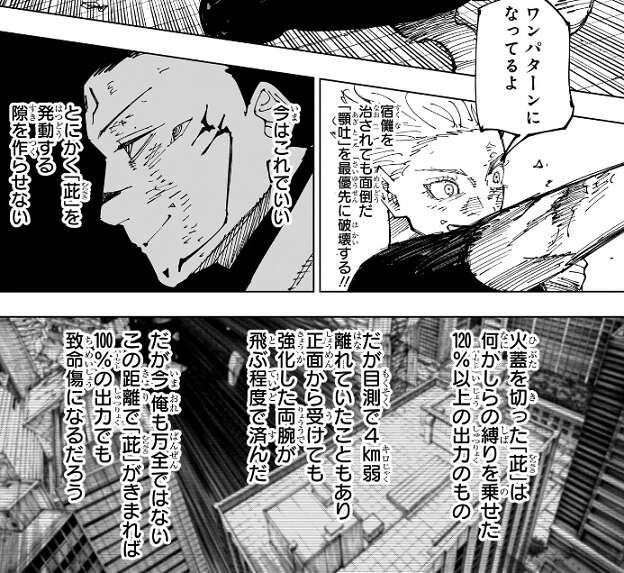 五条は宿儺を回復されても面倒だと考えて、顎吐を最優先で破壊することにします。一方、影に隠れている宿儺は、今は「茈」を発動する隙を作らせなければいいと考えます。今の万全でない状態の宿儺が、この距離で「茈」がきまれば100%の出力でも致命傷になるだろうと推測し、「茈」を警戒します。